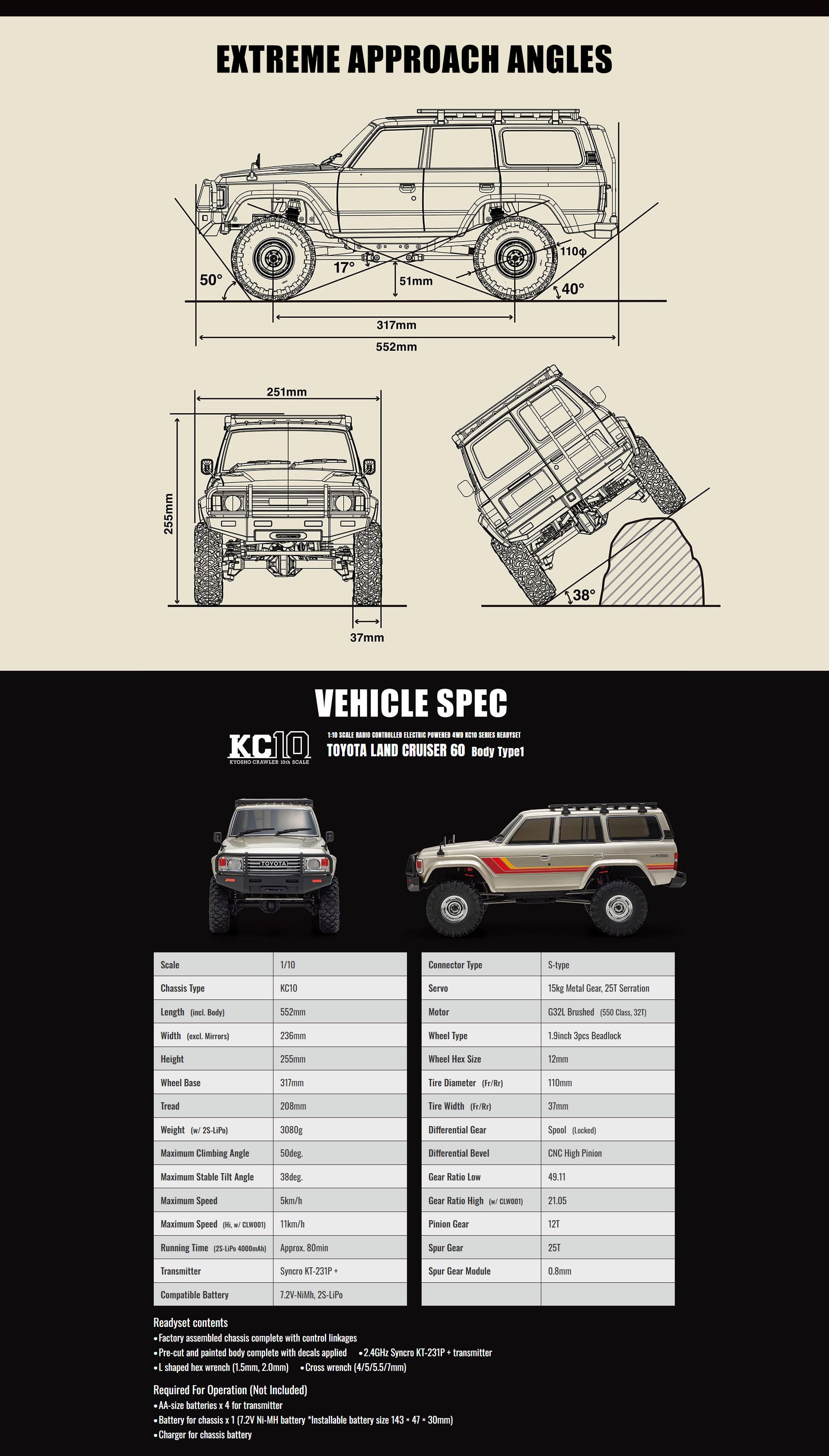 Elektronisch ist das Modell vollständig ausgestattet: Ein G32L Brushed 550 Motor, ein wassergeschützter Fahrtenregler, ein kraftvolles 15-kg Metallgetriebe-Servo sowie die Kyosho Syncro KT-231P+ 2.4GHz Fernsteuerung sind bereits enthalten und installiert.