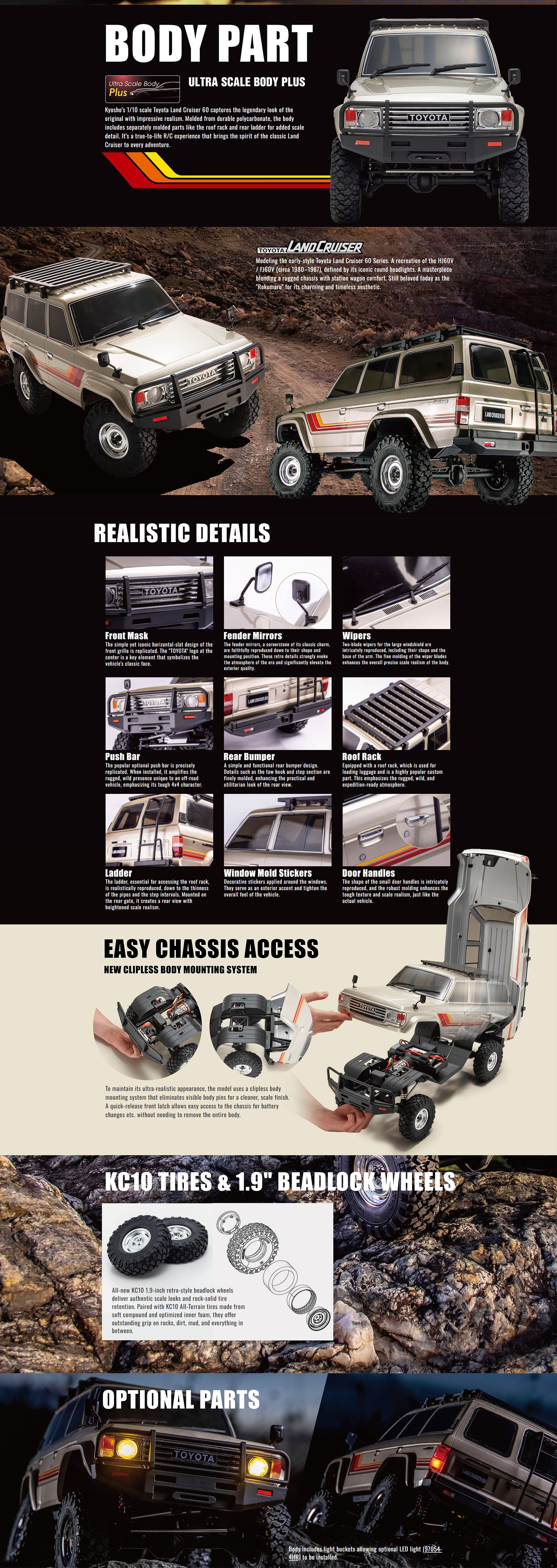 Der Kyosho 1/10 Toyota Land Cruiser 60 KC10 ist ein hochdetaillierter Scale-Crawler im Maßstab 1:10, der klassische Offroad-Optik mit moderner RC-Technik kombiniert. Als offiziell Toyota-lizenzierter Readyset bietet dieses Modell sofortigen Fahrspaß bei gleichzeitig außergewöhnlichem Realismus.